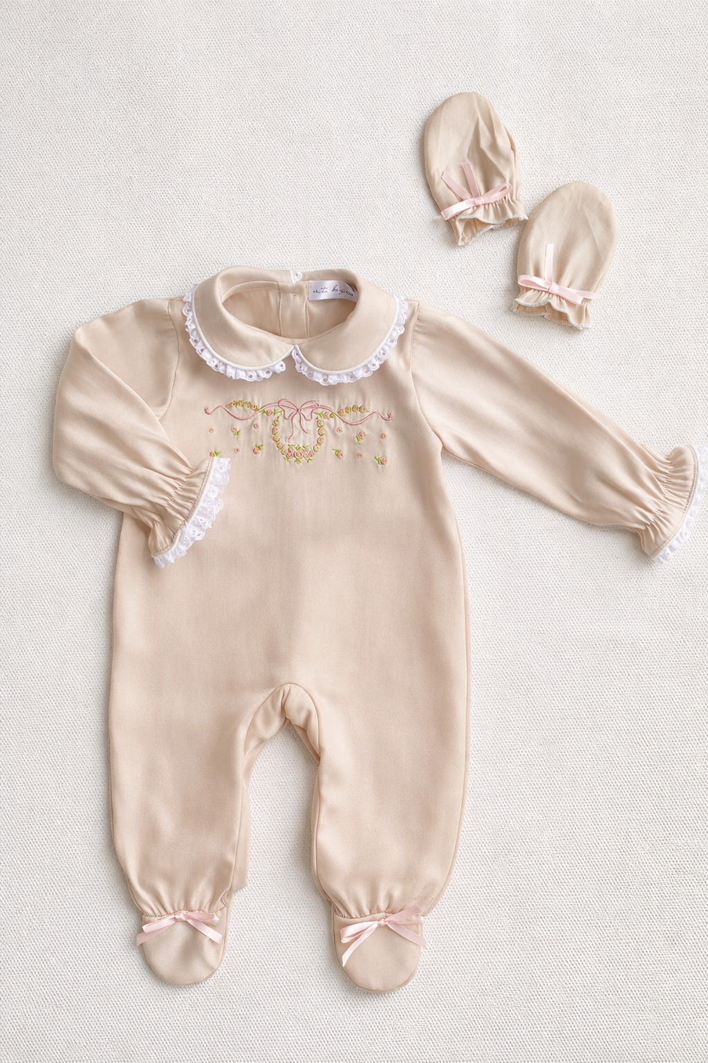 Our 100% silk embroidered baby gift set is the perfect gift for a new baby or mom to be! This perfect baby shower gift set includes a baby footie, blanket, pillow, headband, and mittens. Custom name embroidery add on available. Embroidery will be added to either the left or right collar on the footie and above the ribbon embroidery on the pillow and blanket. The standard embroidery thread will match the pink thread used for the ribbon embroidery. Alternate positioning and thread color is available. Please note variation requests in the information box.