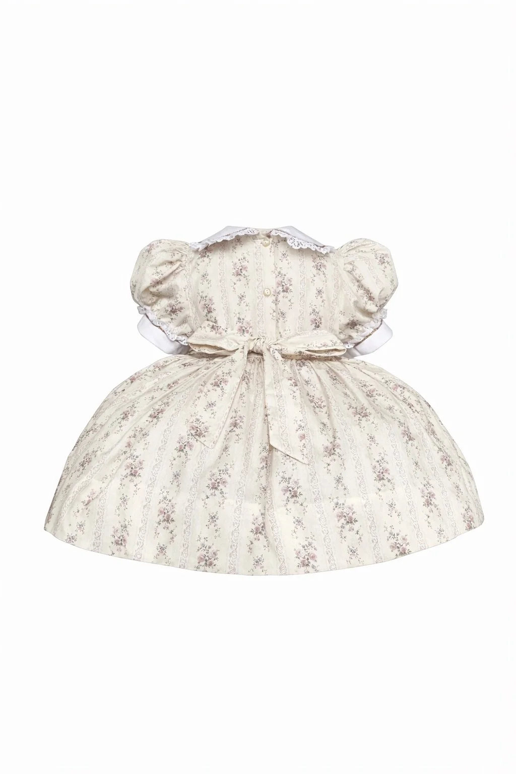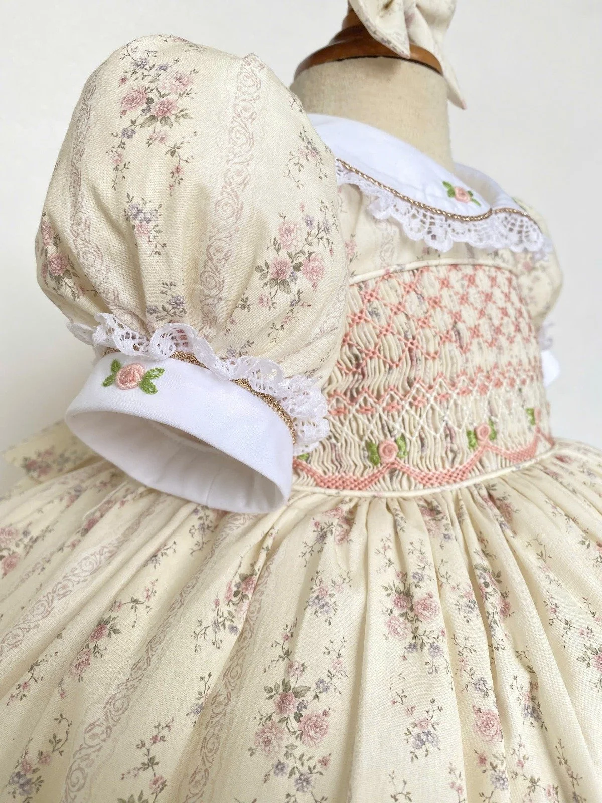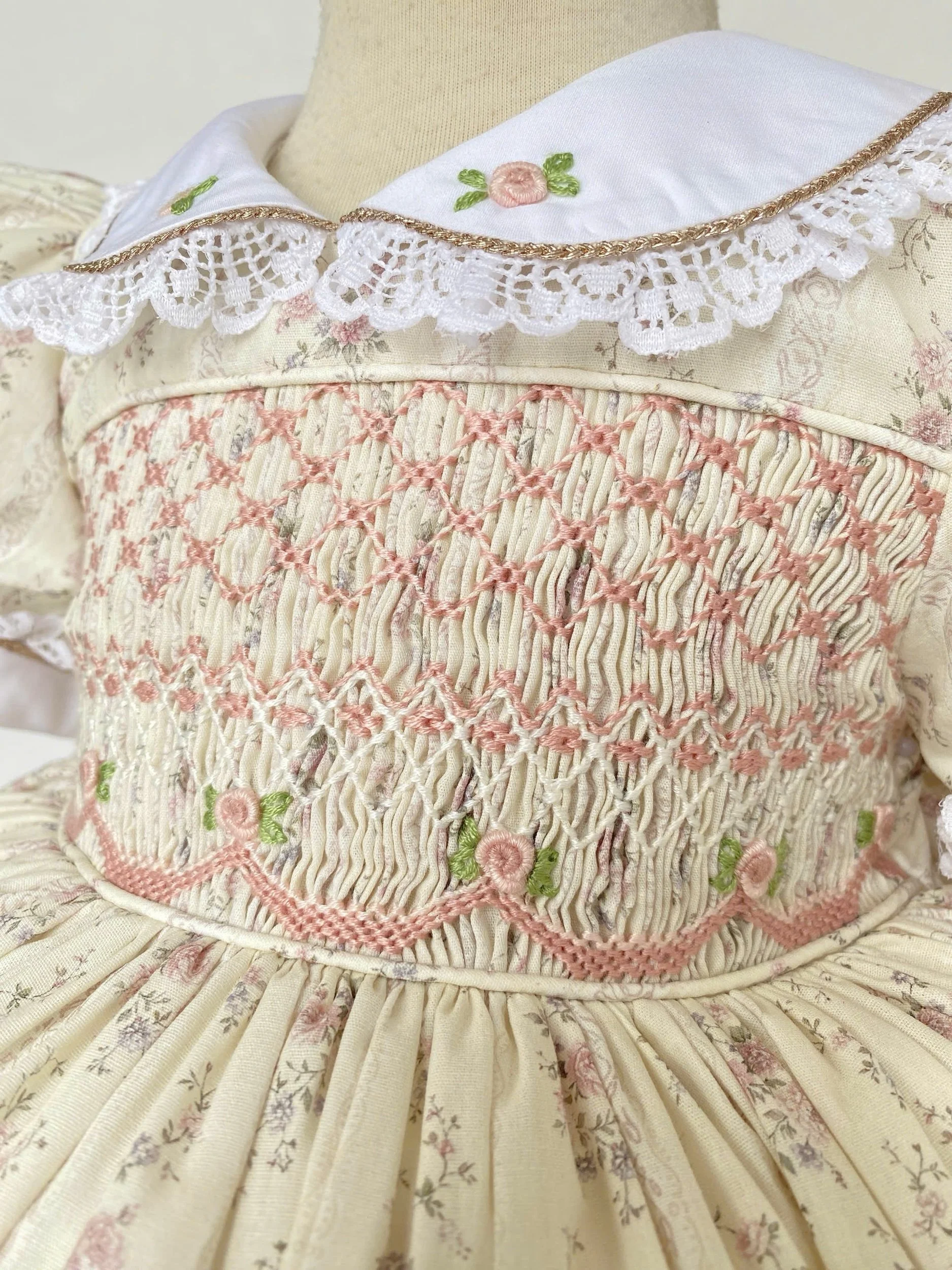 This beautiful dress is a timeless heirloom piece, crafted in a soft ivory fabric and finished with refined, delicate details. The hand-smocked bodice features intricate geometric stitching accented with subtle embroidered floral motifs in soft purple tones.