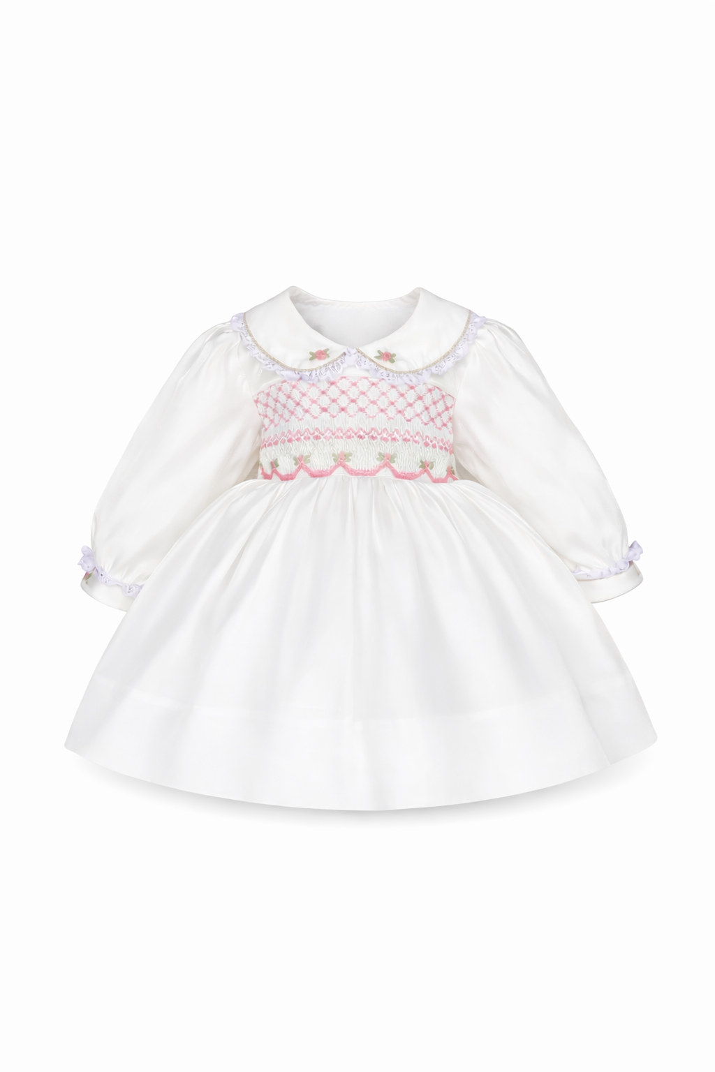This timeless children’s dress is beautifully crafted in a soft white fabric, featuring traditional smocking across the bodice with delicate hand-embroidered floral accents. Designed with a charming Peter Pan collar adorned with gold filigree trim and lace, the dress exudes classic heirloom style. Each dress comes with two matching hair bows to complete the outfit.