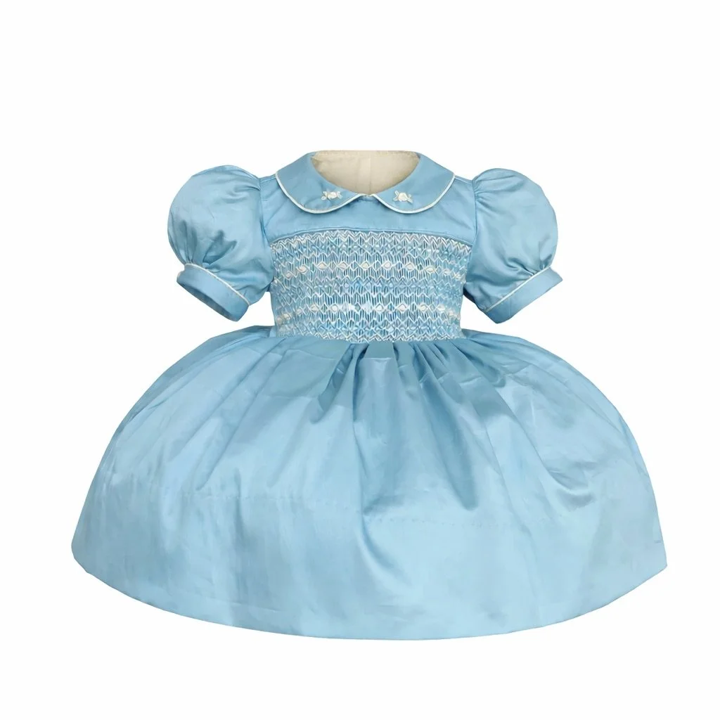 Elegant, timeless, and beautifully detailed, this heirloom-inspired dress is designed for life’s most precious moments. Featuring delicate hand-smocking across the bodice in soft dusty blue tones, this classic silhouette combines traditional craftsmanship with refined charm. This dress comes with matching hair bows and bloomers. The size 12M will come with a headband.